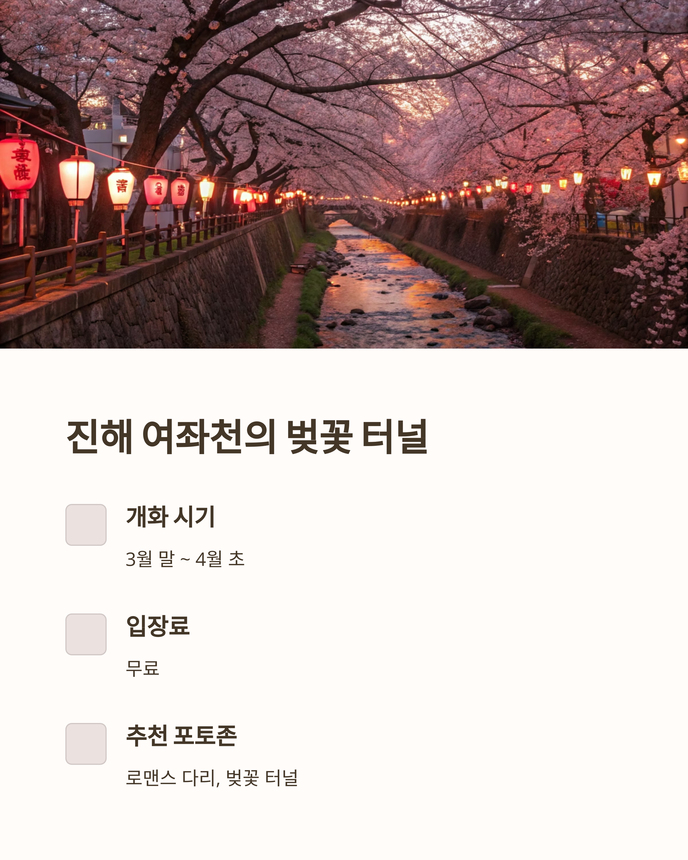 진해 하면 벚꽃, 벚꽃 하면 진해. 매년 4월 초 여좌천 일대는 마치 벚꽃 터널이 펼쳐지는 듯한 환상적인 풍경을 자랑해요. 드라마 촬영지로도 유명한 이곳은 낮에도, 해 질 녘에도, 심지어 비 오는 날에도 아름다워요. 특히 야간 조명과 함께하는 진해 군항제는 로맨틱의 정점을 찍는 경험이죠.